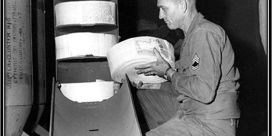 Photo of American USAAF soldier loading leaflets in bomb, circa 1944. Courtesy USAF.