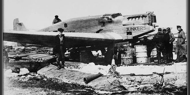 “The prevailing winds in the North Atlantic blow from North America towards Europe, hastening Eastbound airplanes on their way but making headwinds a major problem for those flying West. Köhl, who had flown in the German Army Air Service in World War I, and von Hünefeld, who had been turned away from the Air Service due to his health, attempted the crossing in 1927 but turned back due to poor weather. With the addition of Fitzmaurice, who had served in the British Royal Air Force before resigning to join the Irish Air Corps, they staged a second attempt the following April, using one of von Hünefeld’s two Junkers W33 aircraft, the Bremen.