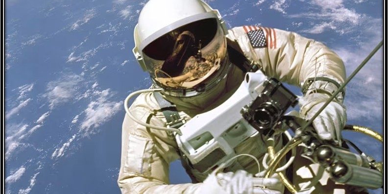 According to History.com and downloaded today from https://www.history.com/this-day-in-history/june-3/an-american-walks-in-space, “On June 3, 1965, 120 miles above the Earth, Major Edward H. White II opened the hatch of the Gemini 4 and stepped out of the capsule, becoming the first American astronaut to walk in space. Attached to the craft by a 25-foot tether and controlling his movements with a hand-held oxygen jet-propulsion gun, White remained outside the capsule for just over 20 minutes. As a space walker, White had been preceded by Soviet cosmonaut Aleksei A. Leonov, who on March 18, 1965, was the first man ever to walk in space.