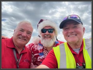 Left to Right: Jody Phillips, Santa & Barry Fetzer/Christmas in July at Moore County Airport, Southern Pines, NC. Temperature on the ramp: 98 degrees F. Photo by Barry Fetzer.