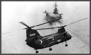 USMC CH-46 D entering the pattern to land on the USS Guadalcanal (LPH-7). Courtesy US Navy.