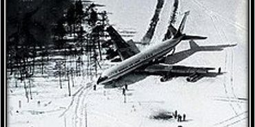 The KAL Korean Air Lines Flight 902 jet, a Boeing 707, after making an emergency landing in the Soviet Union on the frozen Korpijärvi Lake near the Finnish border.
