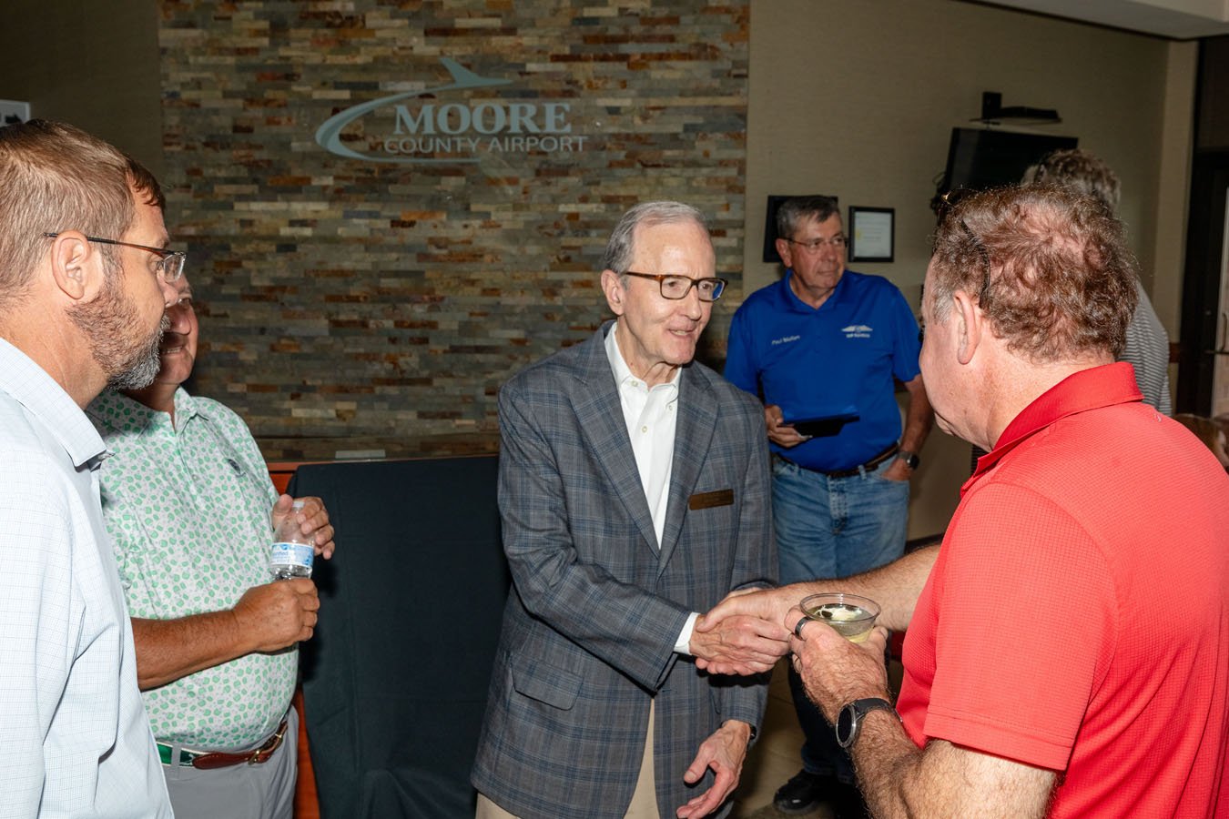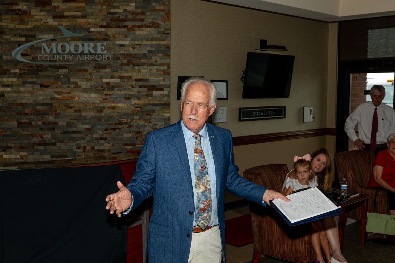 Carthage, NC – The Moore County Airport hosted a Hangar Dedication Ceremony on Monday, July 17th, 2023, in the Airport’s Main Terminal. The dedication was held in honor of former Airport Authority Vice Chairman Barry S. Lerman, who passed away unexpectedly Friday, Feb. 11, 2022. The ceremony was attended by Barry’s family, Airport staff, Authority members, Mayor Strickland of Pinehurst, Mayor Haney of Southern Pines, and Mayor Farrell of Aberdeen, in addition to fellow pilots and friends.