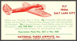 On July 31, 1937, Western Air Express (later Western Airlines) purchased the airway route NPA occupied. Western wanted to expand its route structure in the western United States, and since this overlapped with NPA’s route stop in Salt Lake City, it eventually acquired the entire National Parks Airways airline. “We have a 1936 brochure that promotes a joint NPA-WAE package vacation ‘Sky Tours / America’s Greatest Vacation by Air,’ with highlighted attractions including San Diego, Los Angeles, Boulder Dam, Zion National Park, Salt Lake City, Yellowstone National Park, and Montana dude ranches,” says Force of the Delta Flight Museum’s archives. (Delta and Western Airlines merged in 1987.)