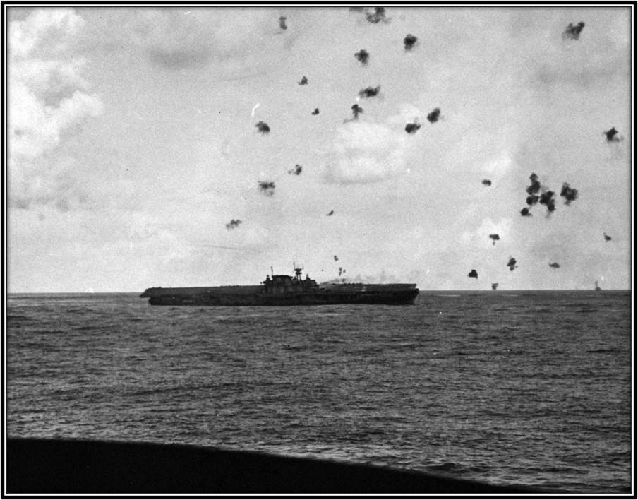 Japanese aerial fire damaged the USS Enterprise, the battleship South Dakota, and finally the Hornet. In fact, the explosions wrought by the Japanese bombs that rained down on the Hornet were so great that two of the Japanese bombers were themselves crippled by the blasts, and the pilots chose to dive-bomb their planes into the deck of the American carrier, which was finally abandoned and left to burn. The Hornet, which weighed 20,000 tons, had seen battle during the Doolittle Raid on Tokyo (its commander at the time, Marc Mitscher, was promoted to admiral and would be a significant player in the victory over Japan) and the Battle of Midway.